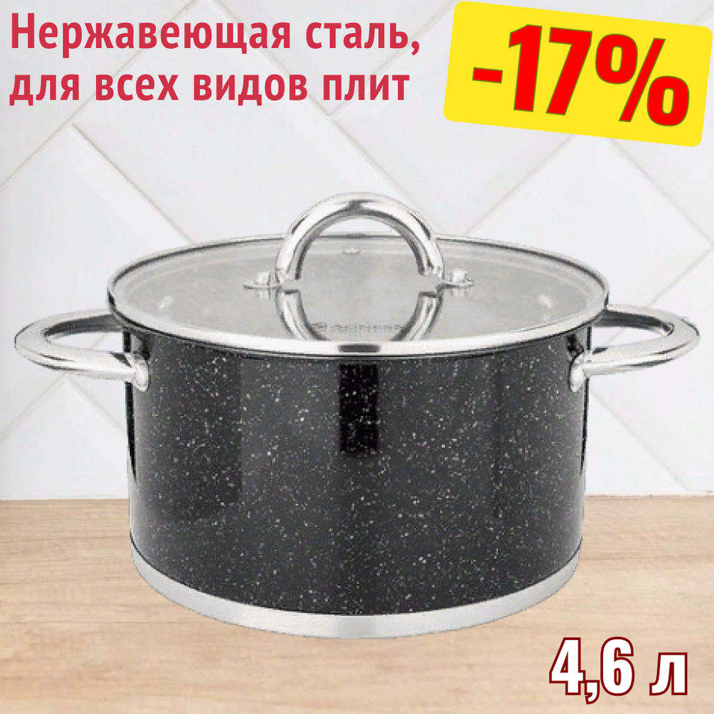КАСТРЮЛЯ AGNESS СО СТЕКЛЯННОЙ КРЫШКОЙ, НЕРЖ.СТАЛЬ, СЕРИЯ BLACK MARBLE 4,6Л 22Х12,5СМ