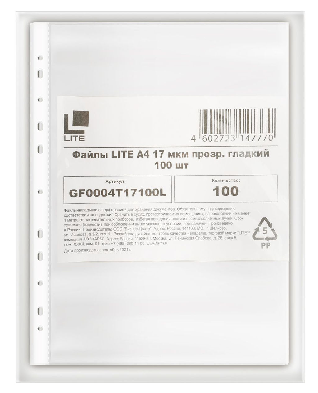 Файлы LITE А4, 17 мкм, прозрачные, гладкие, 100 шт.