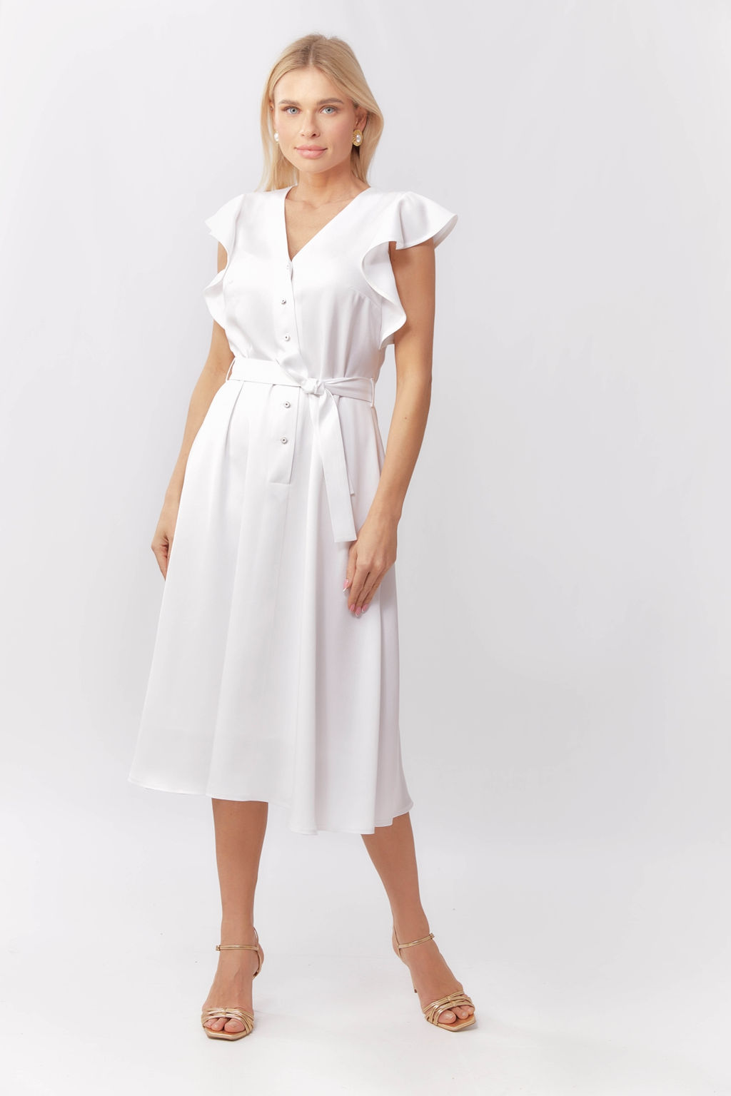 Платье отрезное по талии с рукавами-крылышками и струящейся юбкой из легкого тенселя в белом цвете