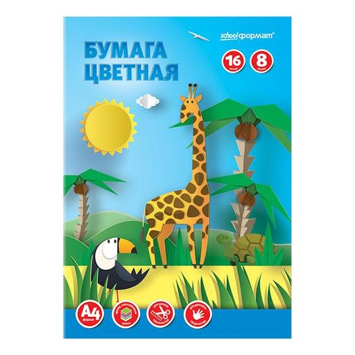 Бумага цветная офсетная Schoolformat А4, 8 цветов 16 листов, 65 г/м2 на скрепке