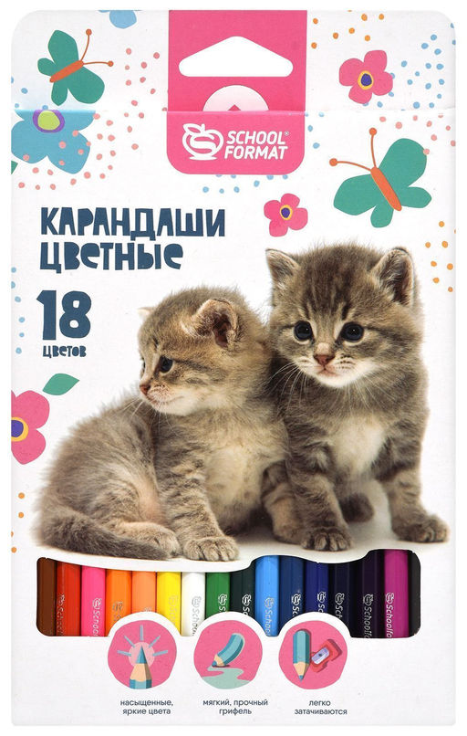 Набор цветных карандашей Schoolformat ПУШИСТЫЕ КОТЯТА 18 цветов, шестигранные