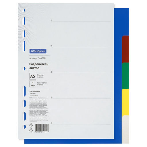 Разделители листов А5, 5шт., без индексации, цветные (OfficeSpace, 366060) пластик