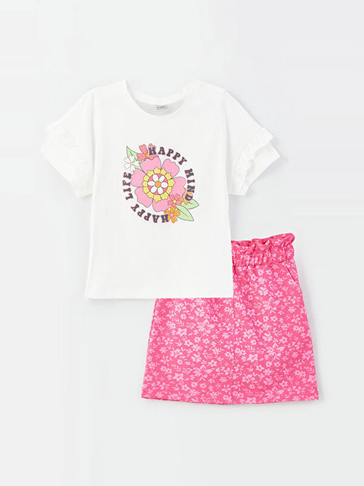 Bisiklet Yaka Bask?l? K?sa Kollu K?z ?ocuk Ti??rt ve Etek