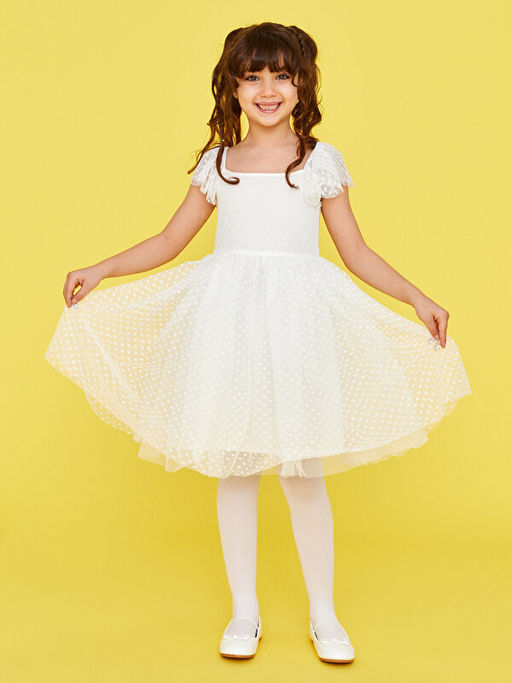 Kare Yaka Kendinden Desenli K?sa Kollu K?z ?ocuk Elbise