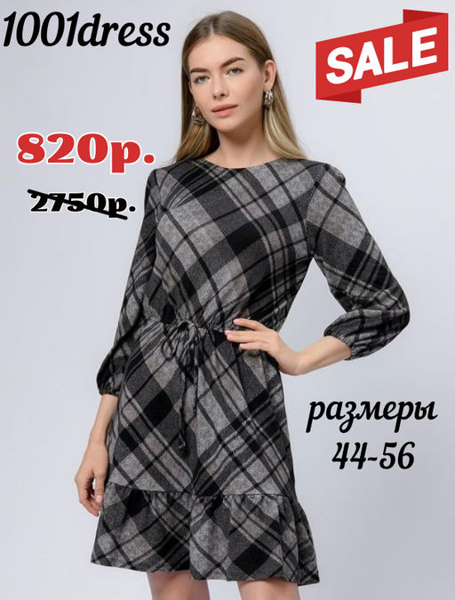 Платье серое в клетку длины мини с воланом