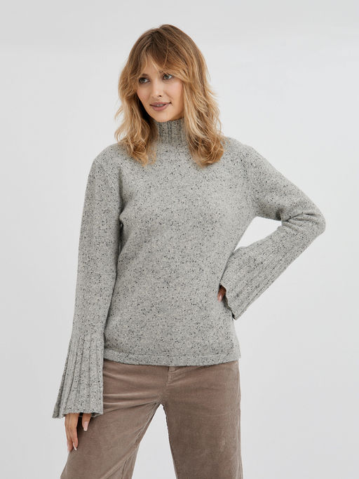 серая меланжевая водолазка с воротником стойкой и с расклешенными рукавами