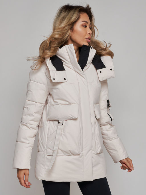 Зимняя женская куртка модная с капюшоном бежевого цвета 589827B