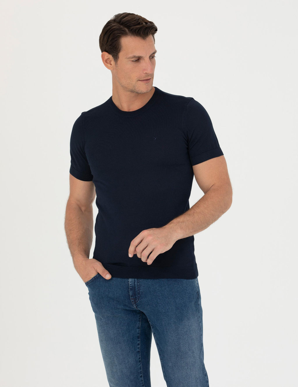 Темно-синяя приталенная трикотажная футболка с круглым вырезом