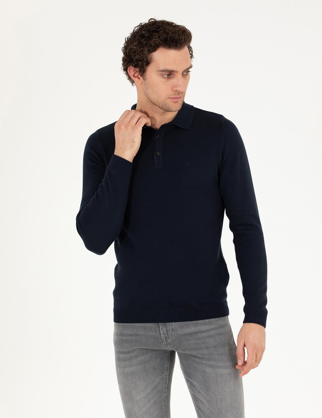 Базовый трикотажный свитер узкого кроя темно-синего цвета с воротником-поло