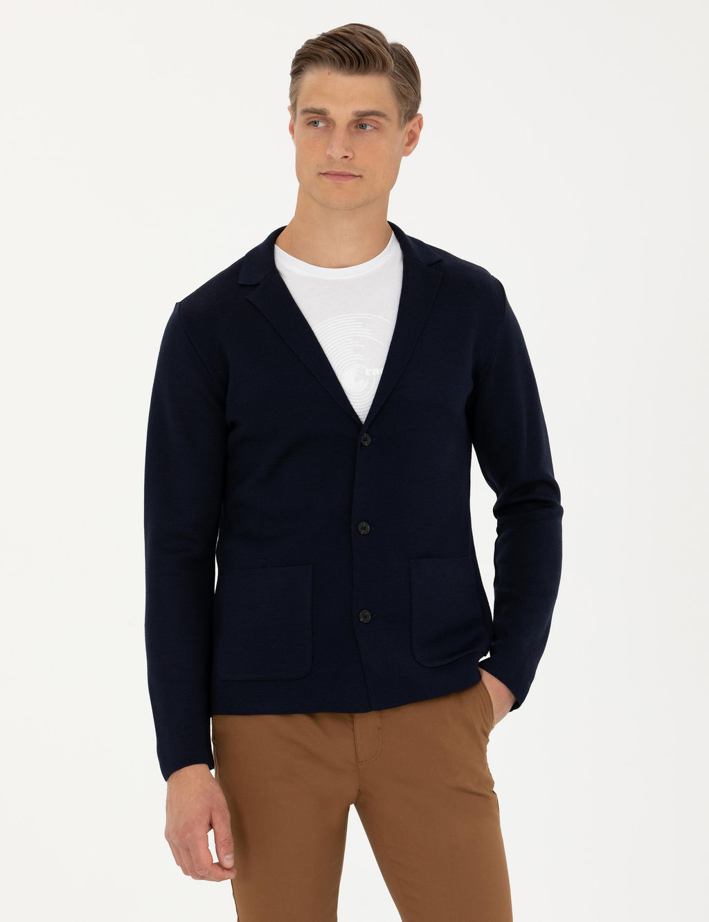 Темно-синий трикотажный кардиган приталенного кроя с v-образным вырезом темно-синего цвета