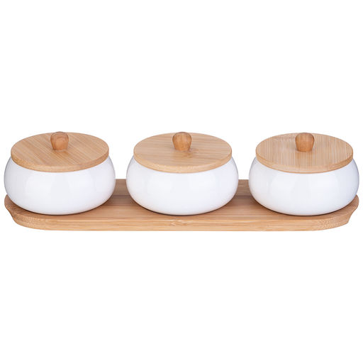 НАБОР БАНОК С ДЕРЕВ. КРЫШКОЙ LEFARD NATIVE 3 ШТ. 8,5*6,5 СМ 150 МЛ НА ДЕРЕВ. ПОДСТАВКЕ
