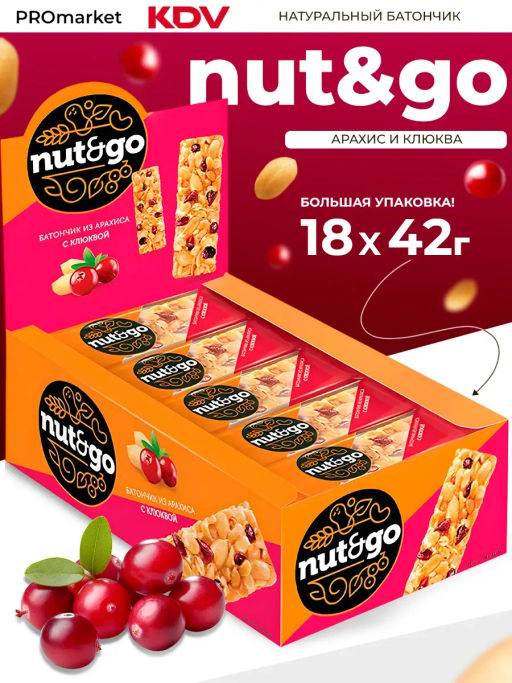 Nut&Go, батончик с арахисом и клюквой, 42 г (упаковка 18 шт.)