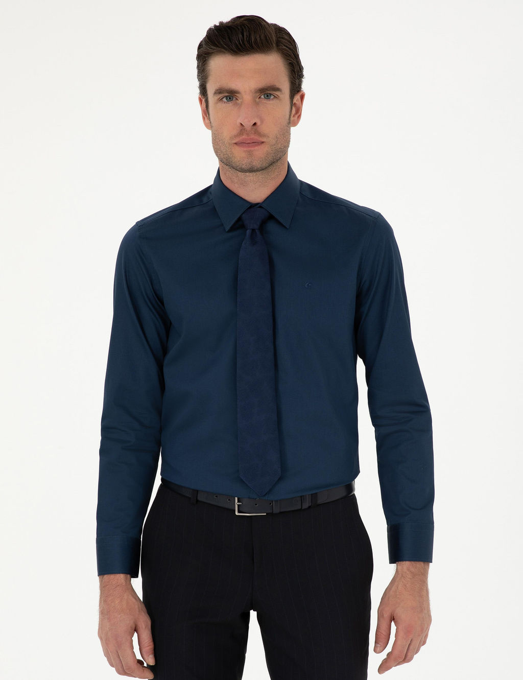 Классическая хлопковая рубашка узкого кроя темно-синего цвета
