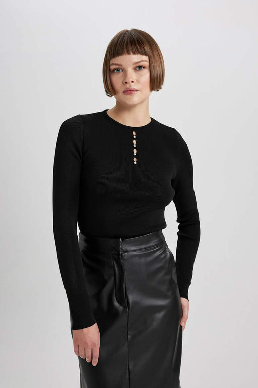 Приталенный свитер в рубчик с круглым вырезом