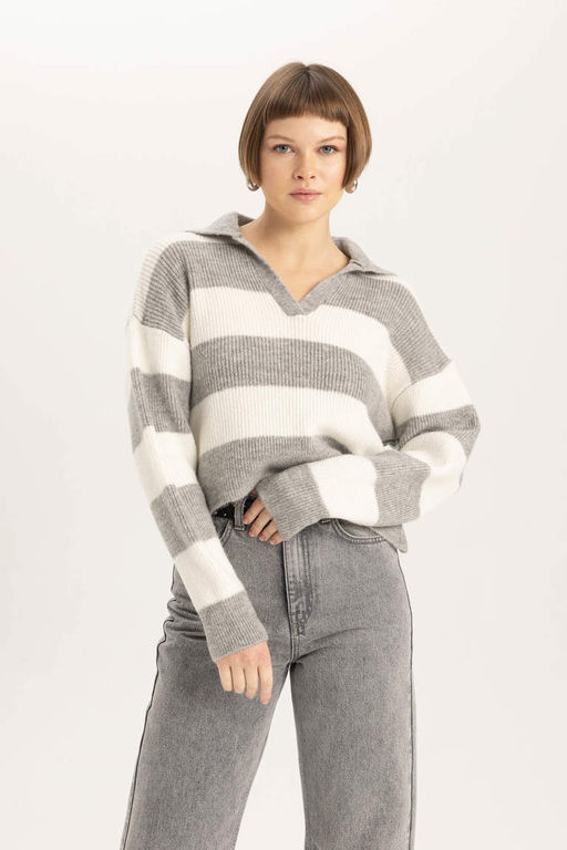 Полосатый свитер из ткани селаник с воротником-поло свободного покроя